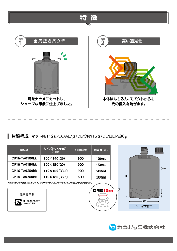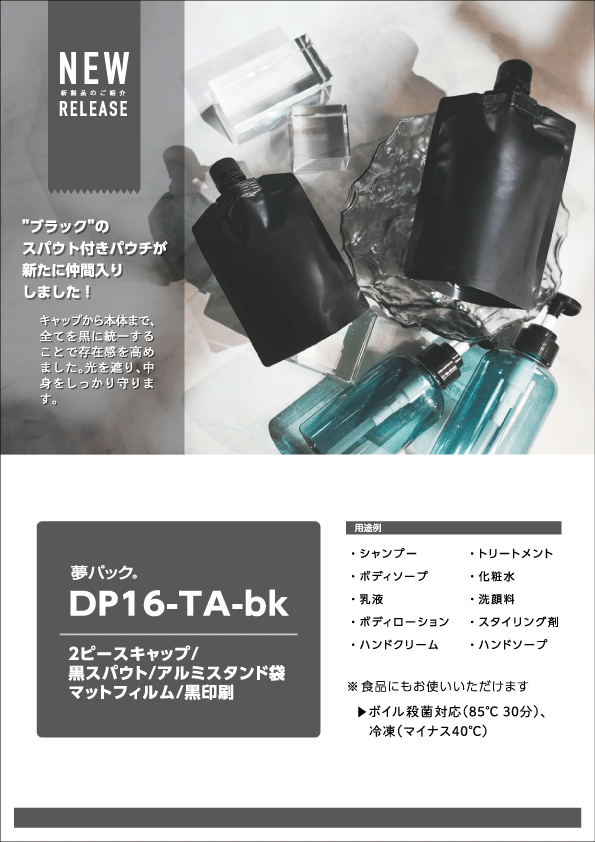 【特 長】ブラックのスパウト付きパウチが新登場!キャップから本体まで、全てを黒に統一することで存在感を高めました。肩を斜めにカットしシャープな仕上がり、光を遮り、中身をしっかりと守ります。黒のフルボディタイプでマットPETとアルミ箔を採用!ボイル殺菌85℃×30分、冷凍-40℃対応。食品にもご使用頂けます。